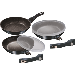 מחבת 24 ס"מ, סיר 24 ס"מ 4.8 ליטר עם מכסה זכוכית, מכסה פלסטיק המתאים לסיר ולמחבת וידית נשלפת.